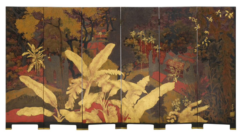 | Panneau laqué (format moyen) | compositions classiques, pagodes, rizières, villages | 25 000 € | 180 000 € |
